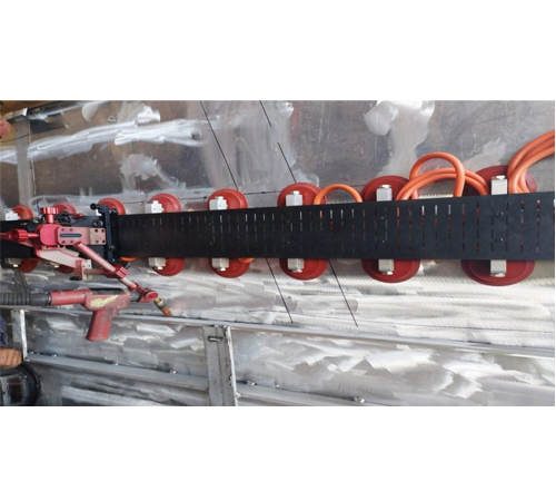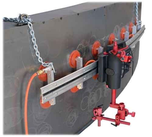 Promotech’s system consists of a vacuum pump that generates vacuum and of vacuum units that fix the semiflexible or rigid track to the surface. A single pump provides gauge pressure sufficient for up to 21 vacuum units. A single vacuum unit provides suction power of 1400 N (at gauge pressure of –0.7 bar / –10 psig). The permitted load is up to 30 kg (66 lbs) – welding/ cutting tractor with accessories. Semi-flexible track can be fixed on flat or curved surfaces with a radius of at least 5 meters (16 ft). An optional manifold can separately connect vacuum units of up to four rails, what allows rail leapfrogging during operation. Temperature of material on which vacuum pads are used cannot exceed +320°C (608°F). Heat source must be kept at least 100 mm (4″) away from vacuum pads. Safety eye bolts are provided to suspend vacuum rail tracks and protect them against accidental fall.