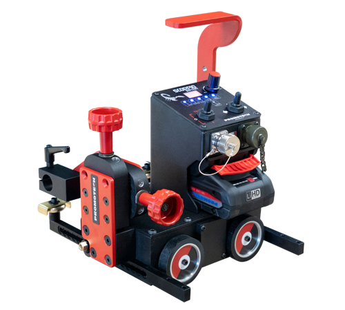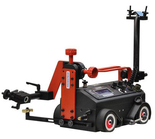 The 4-wheel drive system and permanent magnetic base provide powerful traction and smooth travel. Travel speed control and stabilization enable precise matching of weld bead geometry to required specifications, reducing costly over-welding and significantly decreasing filler metal consumption. The torch can be swapped from one side of the MINI SPIDER BATTERY to another, enabling the operator to weld the entire workpiece from end to end.